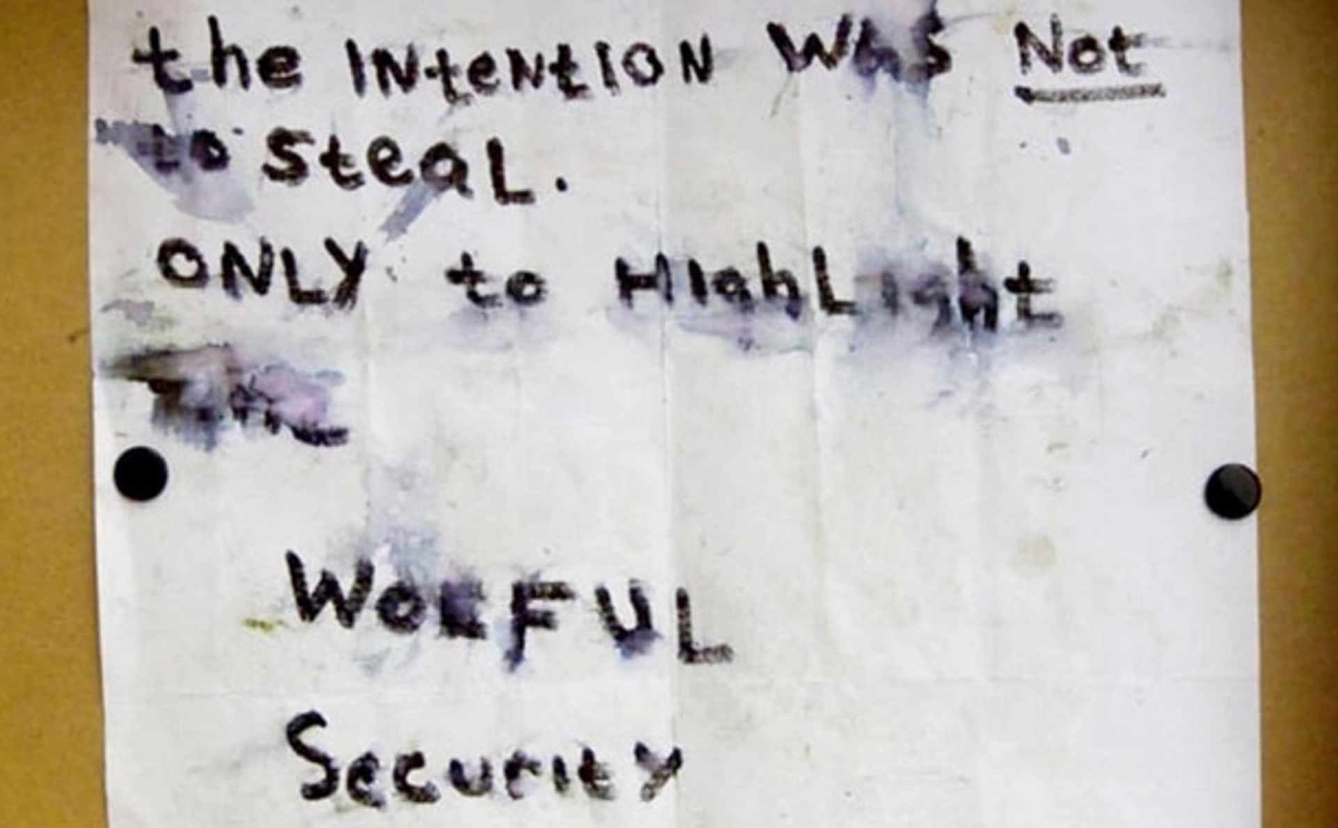 Waterstained note left with the recovered artworks