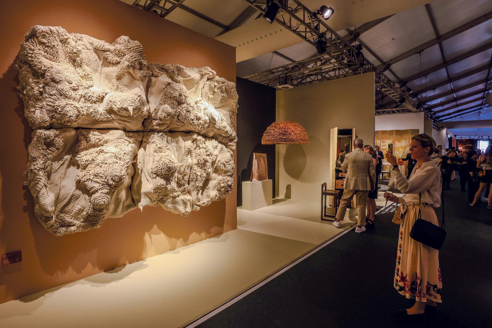 For London-based Sarah Myerscough Gallery, the Chinese artist Lin Fanglu worked with craftswomen of the Bai and Dong ethnic minority groups in China to create a massive woven work made by creating knots in natural cotton using meticulous traditional techniques. Lin’s work often takes sculpture- and landscape-inspired forms, the gallery says, and is meant to symbolise female empowerment.