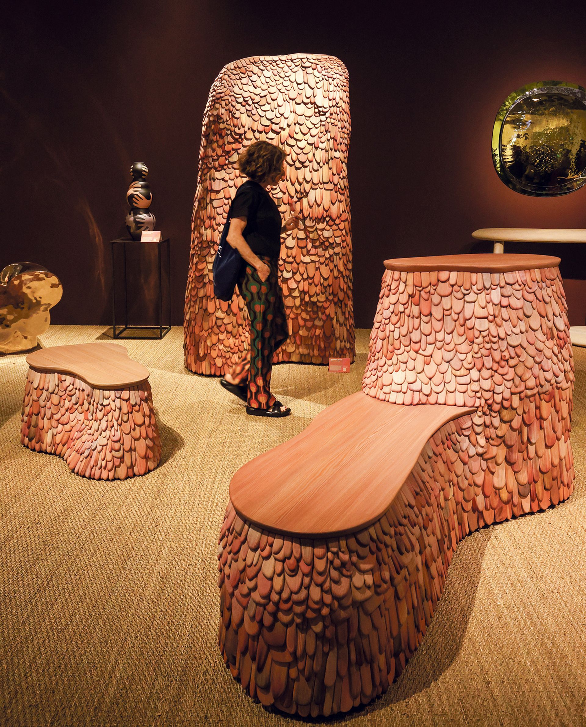 Gallery Fumi was named the best stand of the fair. The London gallery consistently has a craft-driven, “poetic” presentation of work, fair officials say. This year, it highlights works by the German artist Lukas Wegwerth, who arranges hand-painted wooden shingles on his sculptures and furniture in a series named for armadillos.