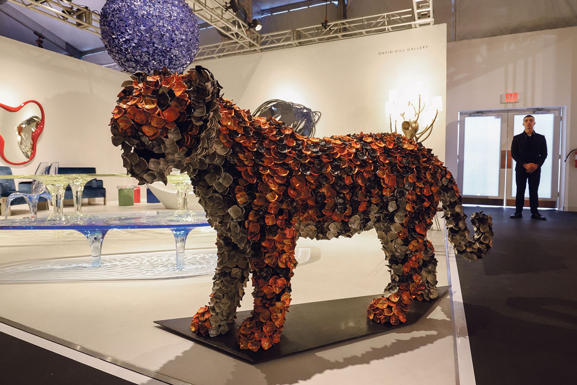 One of the fair’s standout pieces is a large tiger at the stand of London’s David Gill Gallery. Created by the British artist Barnaby Barford, the creature is made up of small, individual ceramic pieces wired together onto a metal frame. This method allows for some movement, and as visitors walk by the stand at the fair, pieces of the tiger can be seen rattling.
