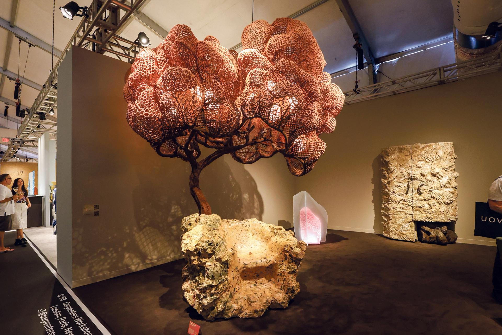 London-based Carpenters Workshop Gallery’s stand features a concrete chair with a large, pink metal tree growing from the base of the seat, complete with lights installed within the tree’s geometric branches. The imposing manmade rendering of a natural form was created by the designer Nacho Carbonell, who in 2009 was named a Designer of the Future at Design Miami Basel in Switzerland.