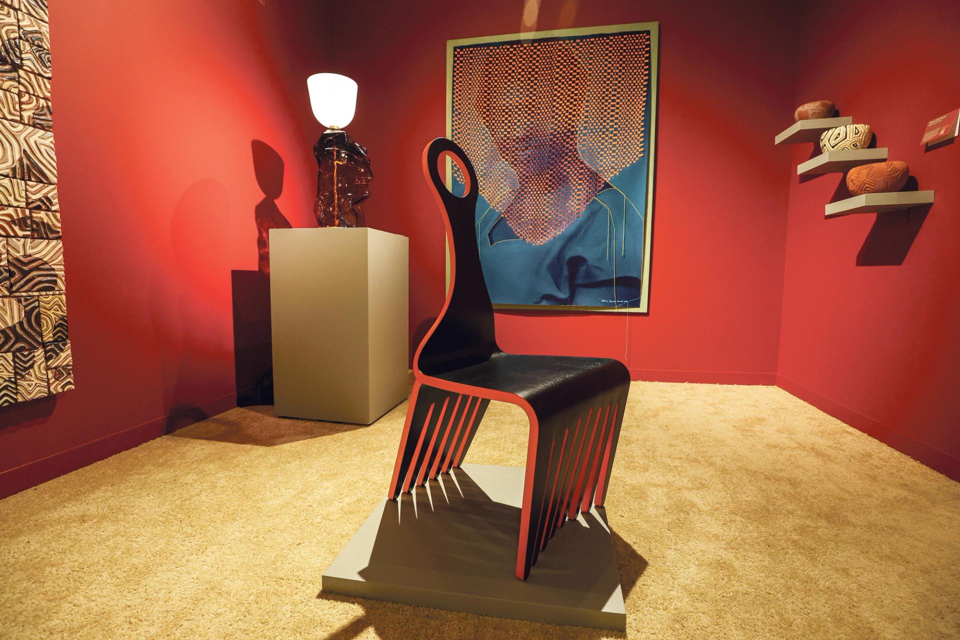 The stand of Wexler Gallery features the work of Jomo Tariku, an Ethiopian American artist who says he likes to take new shapes and apply them to design in order to challenge himself to create good-looking pieces of furniture. The stand features several of Tariku’s designs that incorporate the shape of Afro hair picks. The Meedo series explores the symbolism of the combs and Black beauty standards, with works priced at $32,000 to $95,000.