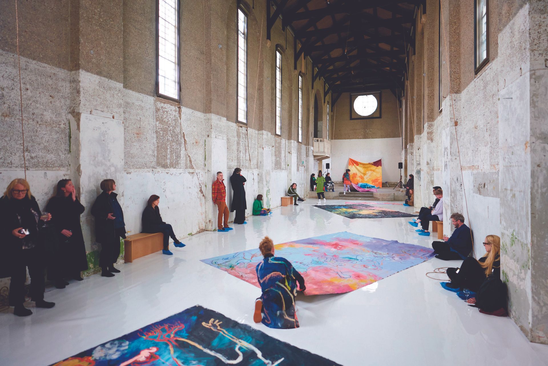 Today, this evocative place is beautifully brought to life by Florence Peake in Factual Reala multi-layered, performative, queer gesamtkunstwerk, which plays with and out of the ritual connotations of its environment to literally struggle with the history of painting. Seven huge unstretched canvases painted by Peake hang from the beams of the vaulted ceiling before being raised and lowered sporadically by six performers using pulleys and ropes. Hoisted up and down, hooked and unhooked, Peake’s giant, vivid paintings of plummeting multi-gender characters are brought to life still by being dragged, crumpled, wedged and used to cover, hide and shelter performers and sometimes audience members. . No longer passive objects to be contemplated, the canvases become active participants in the piece, sliding along the shiny white floor, getting dirty with the dancers, engulfing the audience and even scratching their surfaces to form a sonic backdrop to the action. .
