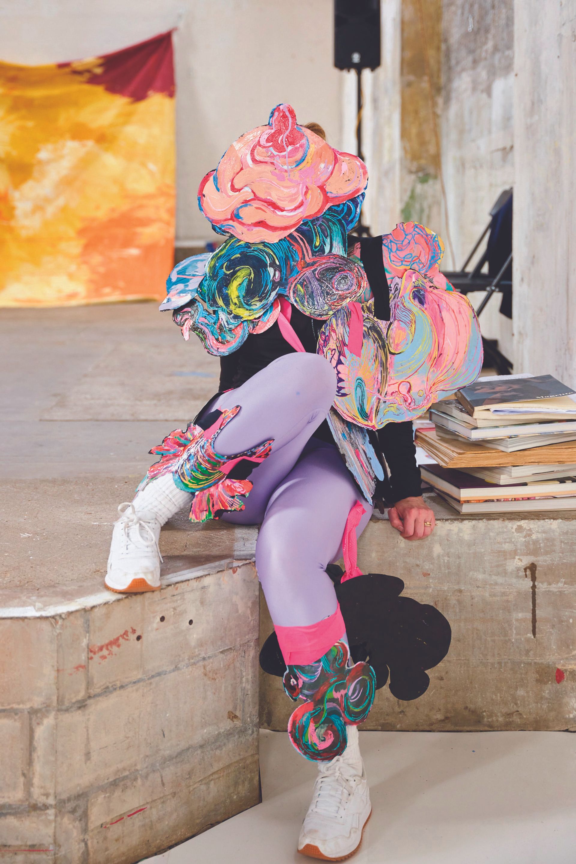 At Florence Peake’s REAL FACTUAL, installation view at Southwark Park Galleries, London (2023). Performer: Rosalie Wahlfrid