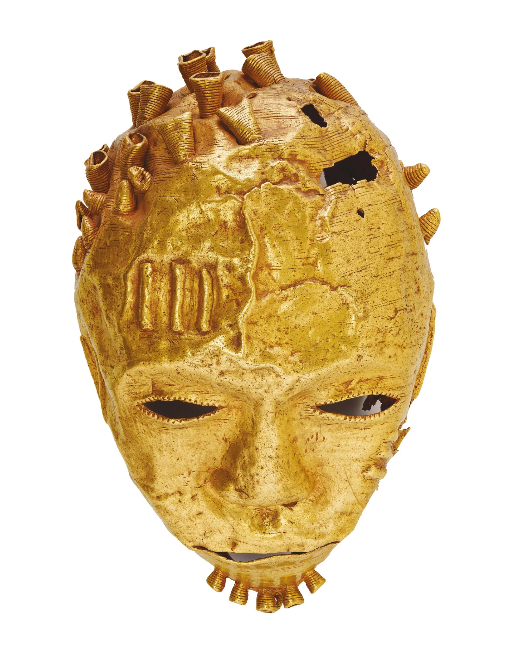 These golden hollow masks with human features were made using a sophisticated lost-wax technique. They represented defeated enemies of the Asante and were attached to ceremonial swords. This example was part of the regalia of Asantehene Kofi Karikari and was seized by British troops at Kumasi in February 1874. Three months later it was purchased by Queen Victoria.
