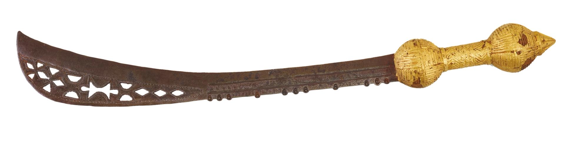 These state swords were carried by high-ranking members of the Asante court. The wooden handle is covered with gold leaf. It would also have belonged to Asantehene Karikari. After its seizure in 1874, General Ponsonby wrote to Queen Victoria, saying that British officers “consider it their duty as well as an honor to submit these articles – or the best of them – to Your Majesty before selling them publicly”.