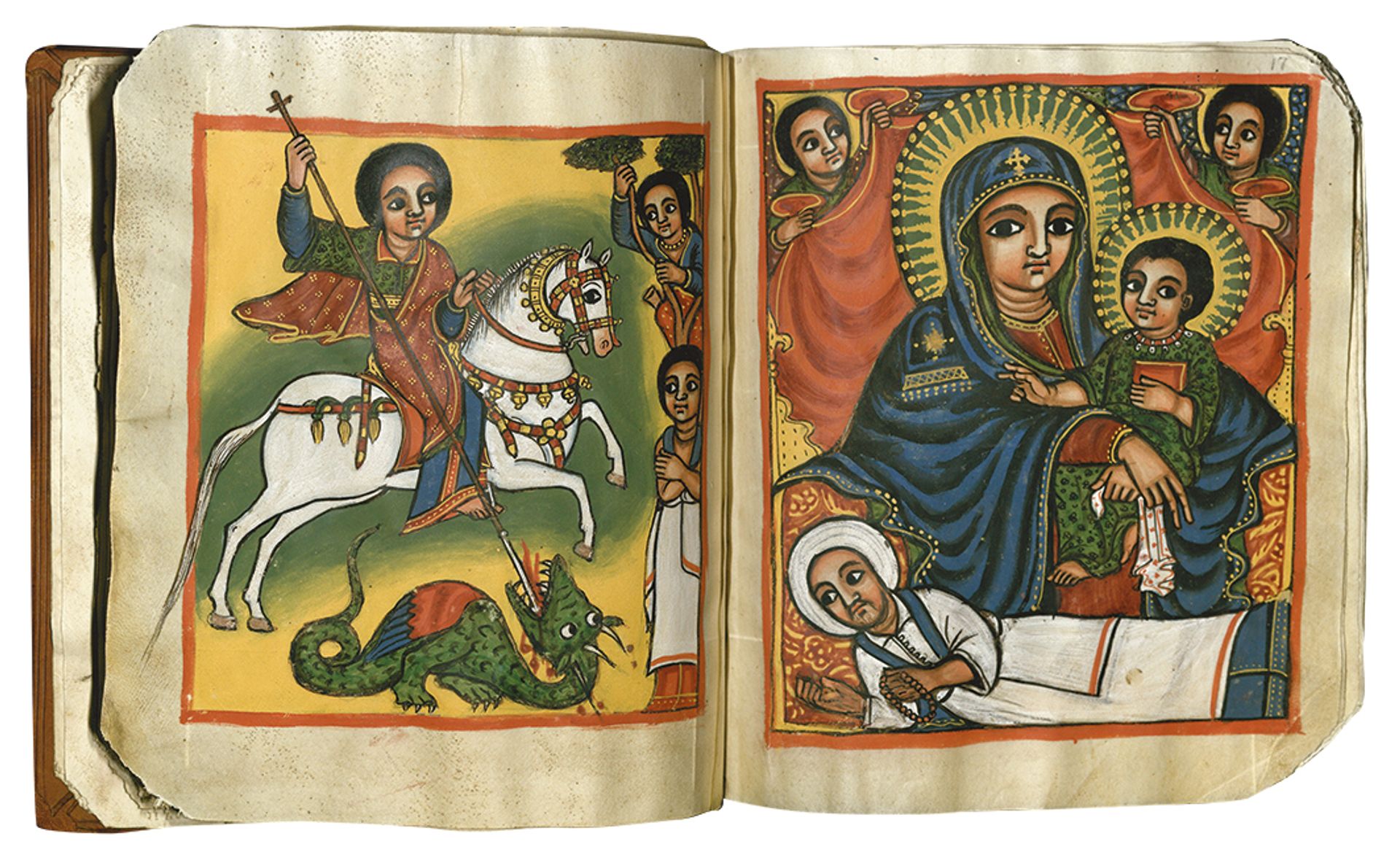 An illuminated manuscript on vellum from the Miracles of the Virgin Mary in Ge’ez, the Ethiopian liturgical language. The book has 13 painted pages, including a Madonna and Child, inspired by the Byzantine icon (perhaps 6th century) currently in Rome at Santa Maria Maggiore. THE miracles was seized from Madhane Alam Church in Maqdala and quickly acquired by British Museum agent Richard Holmes. He presented it to Queen Victoria. The manuscript was bound in London by the India Office in the late 19th century. It is also not visible for conservation reasons.