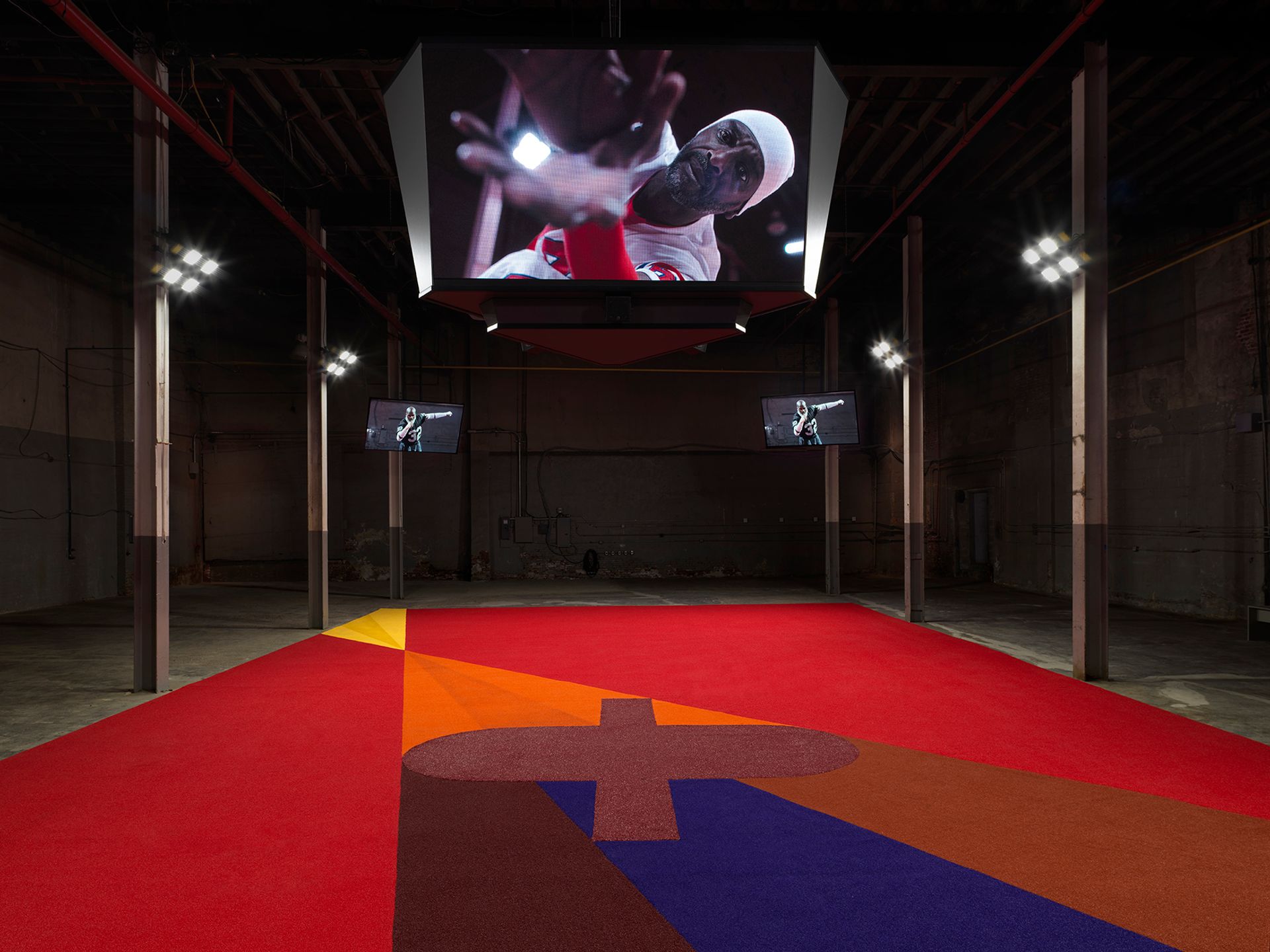 Viewers watched the action on a three-sided jumbotron suspended in the center of the space, near the ceiling, while lounging or standing on a vast carpet printed with the “field emblem” that Barney introduced in Cremaster I, which takes place on a football pitch. Secondary looks back on the same tragic incident that inspired it: a 1978 game between the Oakland Raiders and New England Patriots that left one player, Darryl Stingley, paralyzed for life. His attacker, Raiders defensive back Jack Tatum, walked away without apologizing. Barney watched this incident several times on TV while training to be a quarterback and the memory never left him. While the ensuing uproar led to better body protections for athletes, they didn’t go far enough: The same thing happened to a college football player just last year.