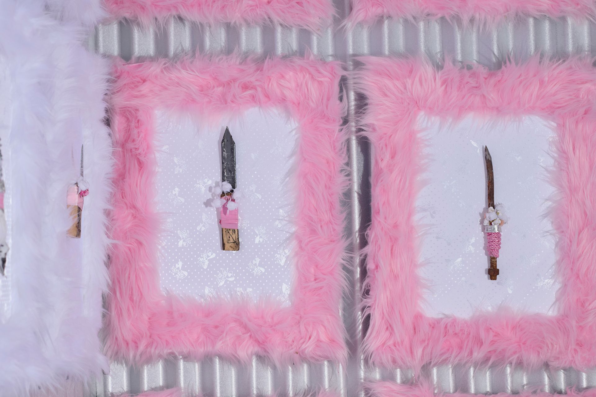 In a hallway of Container, a series of screens show what the artist calls Pussy Riot’s “Legacy Videos,” recordings of the performances that brought the group to worldwide attention. They include footage from a recent performance outside the prison where opposition leader Alexei Navalny is being held, and punk prayer, the 2012 performance in Moscow’s Christ the Savior Cathedral that earned Tolokonnikova and two other activists from the group prison sentences. The wall along the stairway to the gallery’s second floor might look like something out of a nightclub, but the pink squares decorating it frame knives like those made in prison from makeshift materials, like improvised self-protection weapons. These were forged from metal salvaged from an abandoned prison and are fashioned in a distinctive Pussy Riot style into symbols of female power.