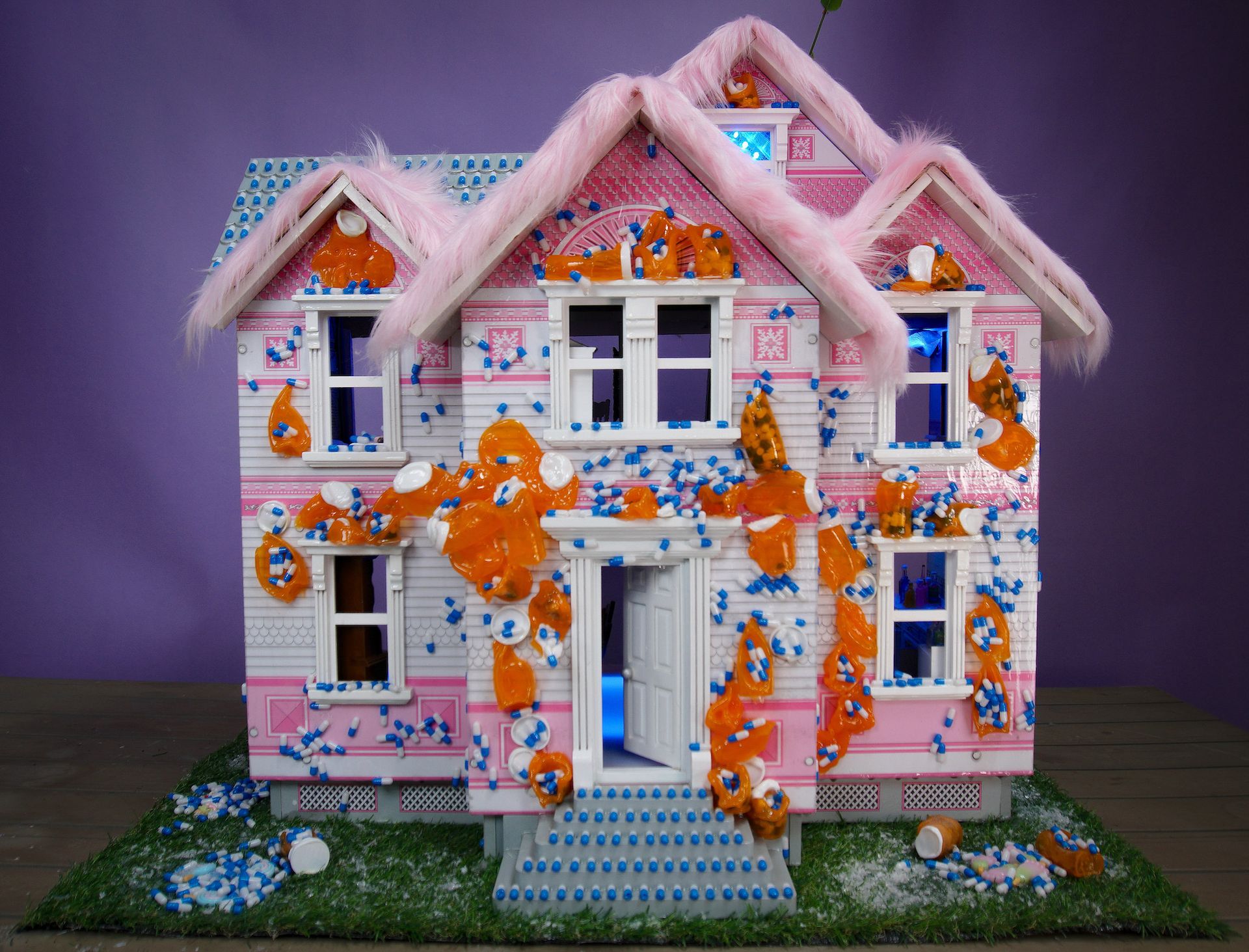 In parallel with the centerpiece of the show, an autumn screening of the short film documenting the Putin’s ashes performance, there are posters with the lyrics of Pussy Riot’s first song, kill the sexist, and text of the sentence of the court of Tolokonnikova. Above the texts are drawings of a Virgin Mary in the shape of a vagina, which the artist claims caused her to be added to Russia. list of wanted criminals. In the center of the room is a sculpture representing a doll’s house, HAUNTED! (2023), whose facade and interiors are covered in orange pills and pill bottles crawling on every surface like invasive species. The pill bottles are for duloxetine, Tolokonnikova says, “the medicine I’ve had to take since I got out of prison because I was diagnosed with PTSD and depression. I hate those pills and try to take them. stop. But they keep coming back into my life. And it’s always a fight.” The work is accompanied by a poetic soundscape created by Bono of U2. A passage states: “I turned my rage into beauty and my raging beauty.”