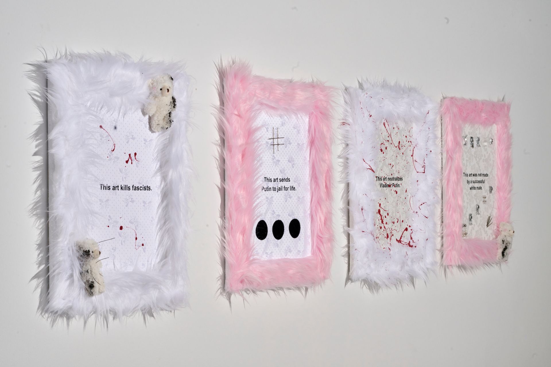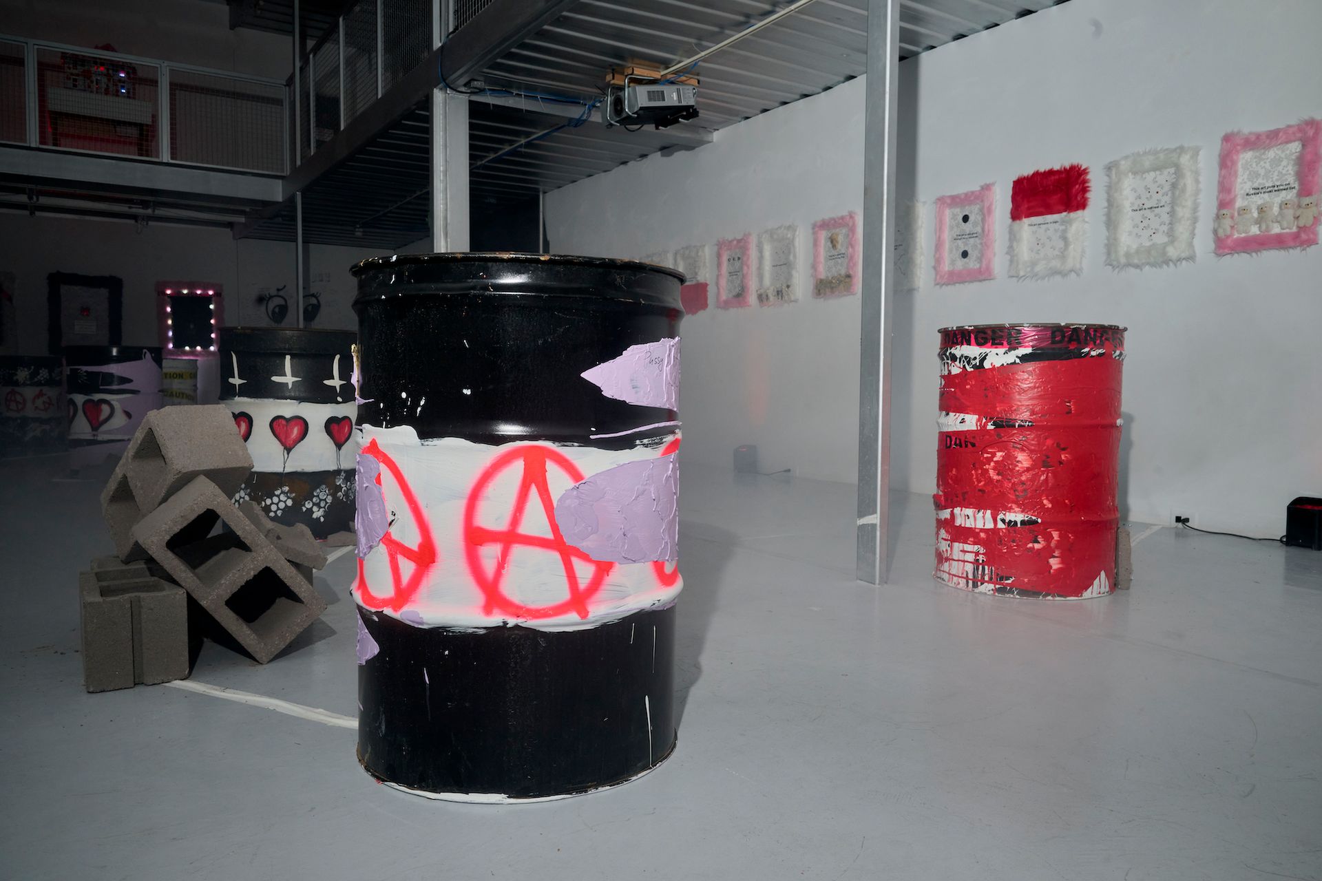 The space is part white cube, part street protest, with paint-splattered barrels placed throughout and graffiti on the walls. Near the entrance are fluff-framed signs with phrases such as “this art is too political” or “this art is created by a criminal.” Some of them are splattered with red paint to evoke blood, some have sewing machine parts attached to them.