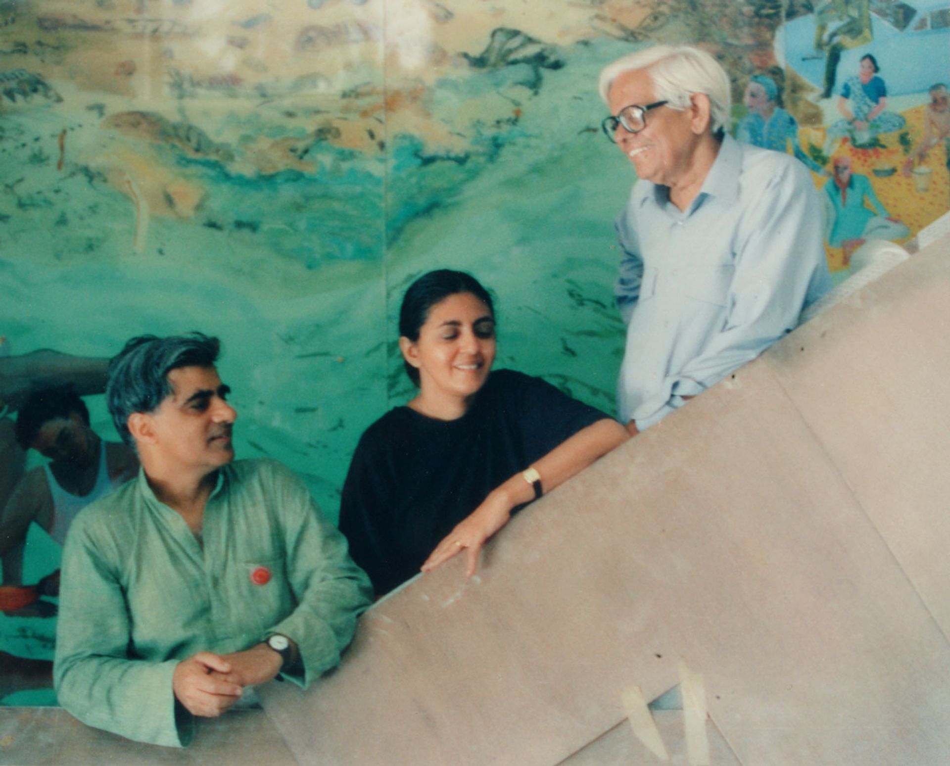 Vivan Sundaram (left) in front Glass mural (1989), at Shah House, Mumbai, with his co-creators of the work Nalini Malani (centre) and Bhupen Khakhar Courtesy of Vivan Sundaram and Sher-Gil Sundaram Arts Foundation