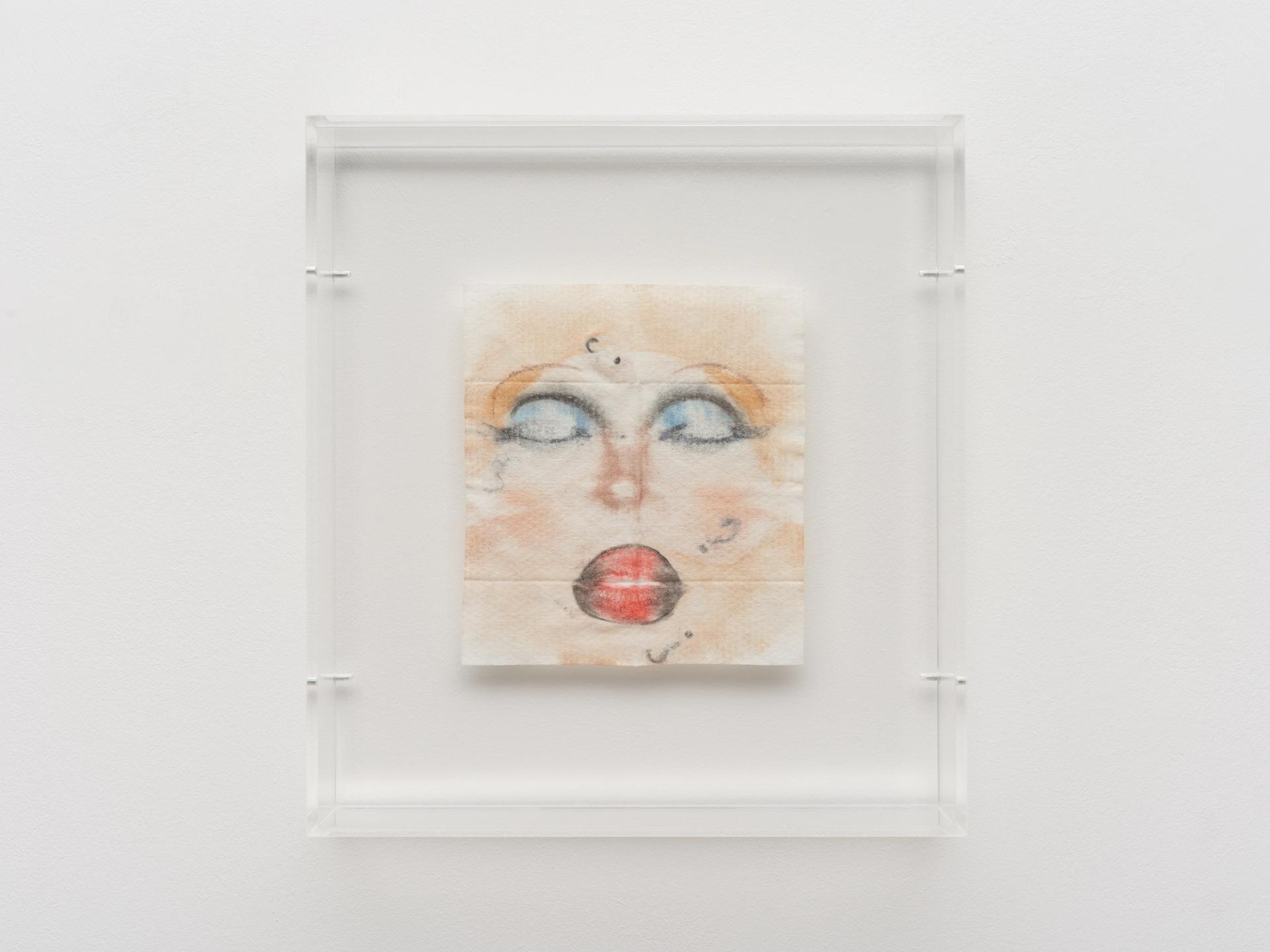 Also in the Memmo show are several busts wearing the wigs used in the movie, as well as a number of Sin’s signature makeup wipes, which bear the ghostly imprints of blush, eyeshadow, foundation, and of the lipstick they wore in the film. “I’ve been doing makeup remover wipes for as long as I’ve been doing drag,” Sin says. The artist cut his teeth on the London drag scene in the early 2010s, and although he no longer actively performs in drag, the culture still heavily influences his work. “These works mean many different things to me – an archive, a vestige or even a death mask of a performance that can never be repeated again.”