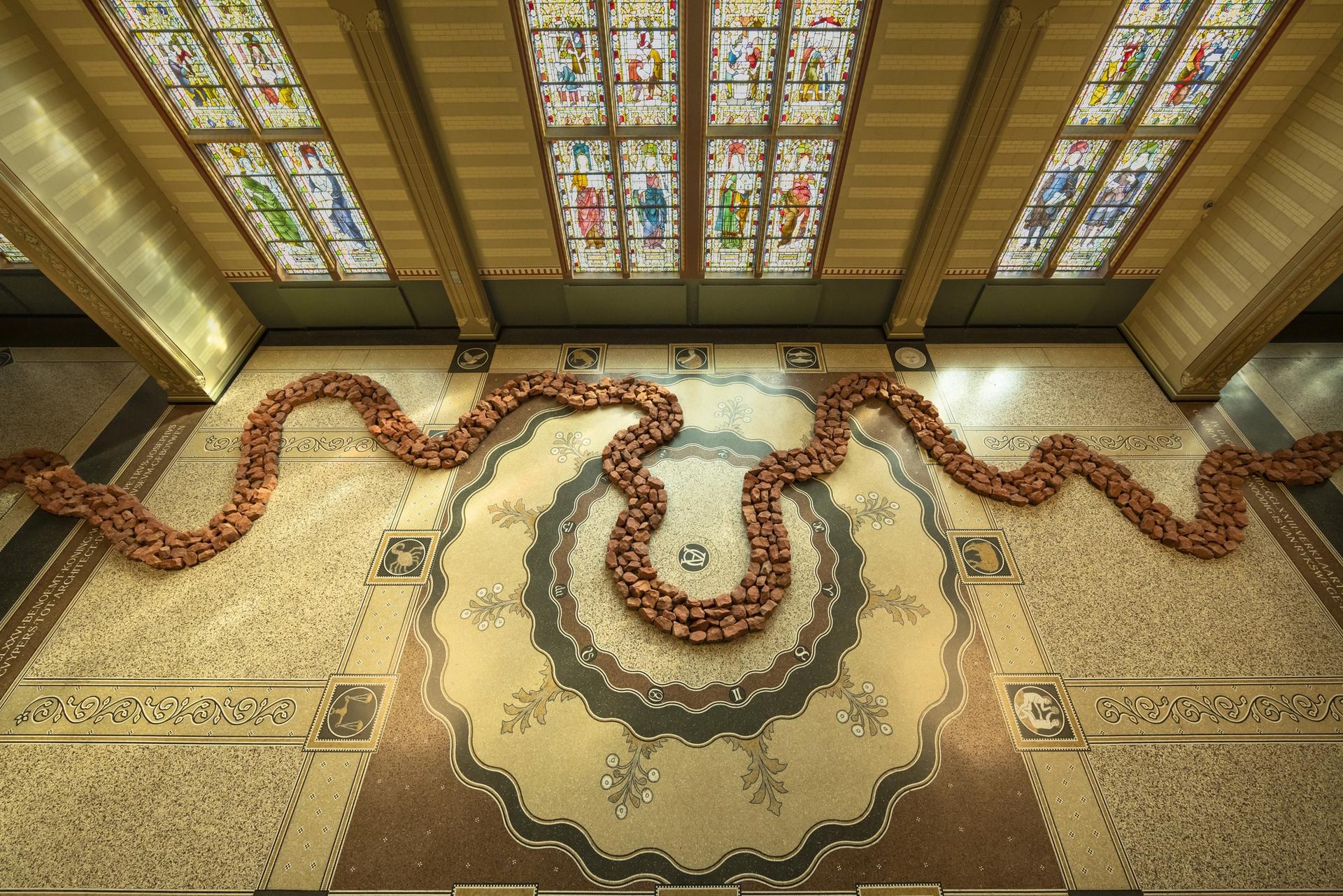 Long, 78, who is known for making simple art by wandering through landscapes, creating photographs and books to document his interventions, says he was sort of the “last of the amateurs” to do art with his own hands. At the Rijksmuseum he mowed grass into shapes, created works by laying stones into shapes, and inside the museum’s atrium and great hall, recreated a large circle and a serpent of stones of Swiss and Indian rock on the marble floor.